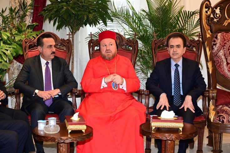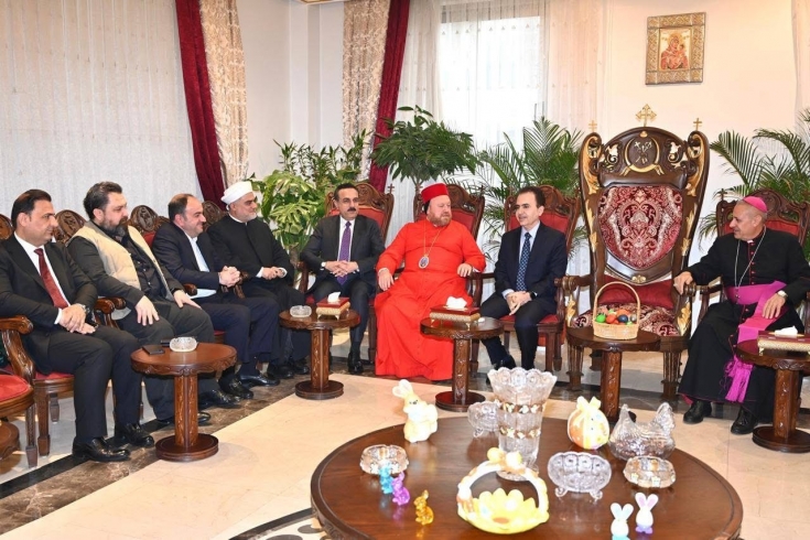 On Sunday evening, April 12, 2026, a delegation from the Kurdistan Regional Government, consisting of Dr. Pshtiwan Sadiq, Minister of Endowments; Ano Jawhar, Minister of Transport; and Omed Khoshnaw, Governor of Erbil, visited "Metropolitan Nicodemus Daoud Matti Sharaf," Archbishop of the Syriac Orthodox Archdiocese of Kurdistan and Mosul, at the Ankawa Judicial Center, to convey holiday greetings.